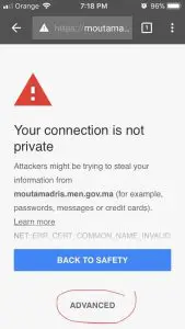 قد تجد ان الموقع لا يفتح، يجب عليك فقط الضغط على ADVANCED ثم الضغط على Proceed to moutamadris.men.gov.ma (unsafe) كما في الصورة :