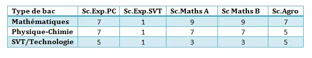 La sélection est réalisée suite à un classement par académie et par type de baccalauréat sur la base des notes de l’examen national des matières scientifiques affectées de coefficients propres à l’IAV Hassan II (cf tableau ci-dessous).